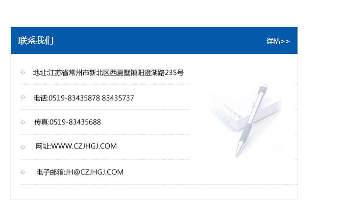 地址:常州市新北區友邦商務大廈1幢16、17層  電話:0519-85101652  傳真:0519-85112595  郵編:213022  網址:www.cz-jiayue_cn.cdyfzs.com  郵箱:xiajifengaa@163.com
